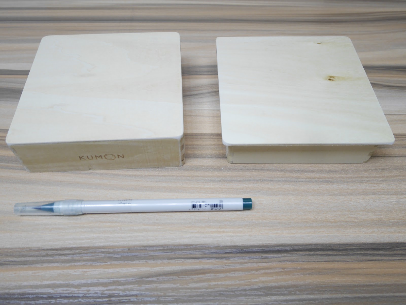 | 木盒和盒蓋平時作為收納棋子的棋盒;對弈時分開可做為一對駒台, 放上吃到的棋子,一物兩用。 (下方筆作為比例尺參考) |
