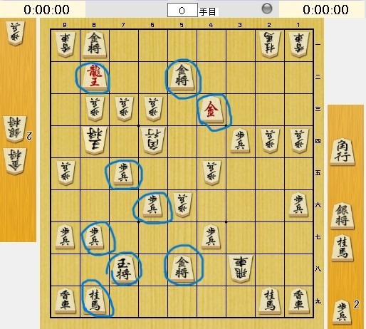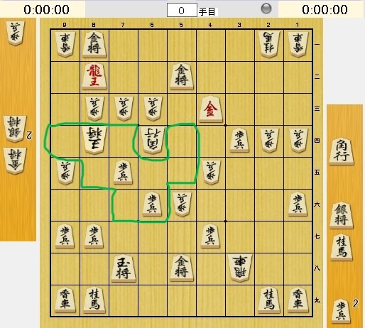 如圖可以看到,先手防守端只剩一枚金將,後手將成「一間龍」之勢。