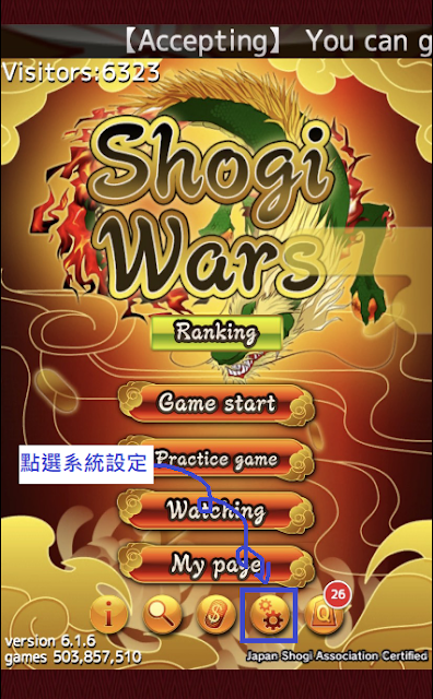 首先開啟英文版介面的將棋大戰(shogiwars),如下圖並選擇系統設定。